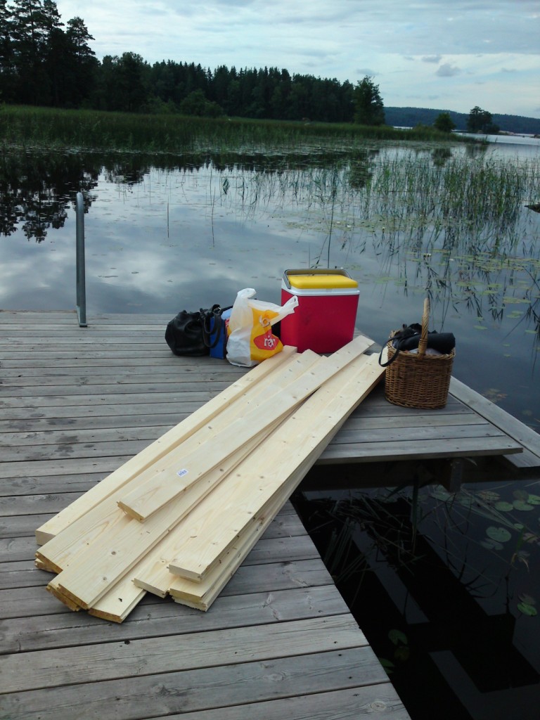 Igår och idag var vi i Paradiset och lagade golvet som var förstört. Det blev ett lass med plankor och diverse verktyg. T hann även tjära hälften av det som var kvar på taket. Nästa gång det "blåser rätt och är soligt" fixar han det sista.